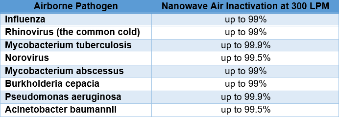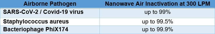 Nanowave technology has been successfully tested against SARS-CoV-2 at multiple labs in the NIAID Biodefence Laboratory Network. Tested devices exceeded maximum airflow speeds of the labs and the virus detection capability of those tests.